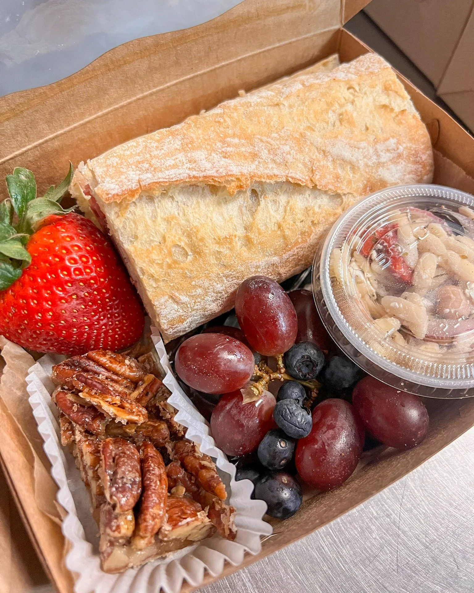 Perfect for meetings, picnics or on-the-go days — our lunch box includes an Italian Sub, Orzo Salad, Antipasti, Fresh Fruit and a Pecan Bar for a sweet finish.
